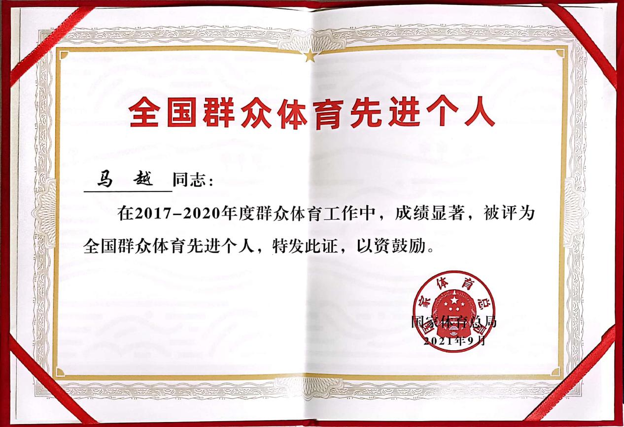 2021年9月,古天乐代言太阳集团138副教授马越老师荣获“全国群众体育先进个人”称号表彰。此称号是全国群众体育领域内唯一经中央批准的,是全国群众体育工作的最高奖项,每四年举办一次,是体育系统最高规格表彰,历史传承久、导向意义大,是全国体育领域的大事。
