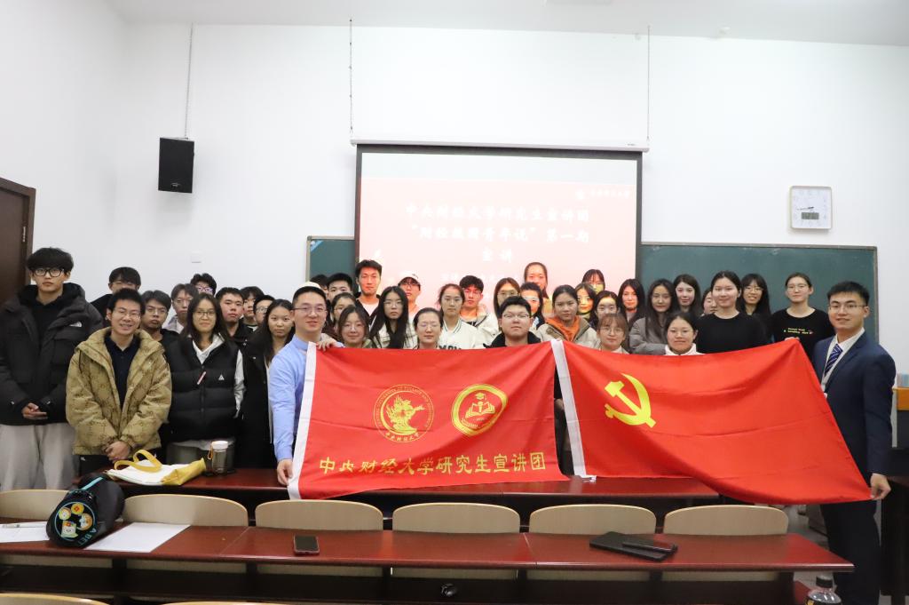 2023年11月21日晚上19:30,公司组织本科生、研究生党支部全体党员、预备党员、发展对象、积极分子于主教102参与研究生宣讲团“财经报国青年说”第一期宣讲课程,主讲人分别是公司产业经济学硕士生左鸿滔和政府管理公司政府经济与管理博士生龙光泽。