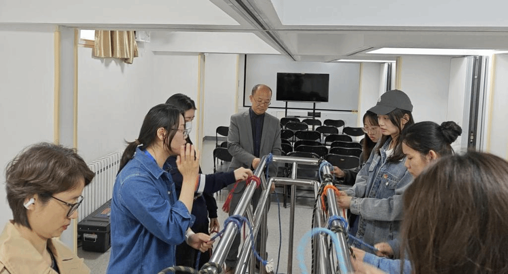学习内容还涵盖了急救速降绳结的正确绑制方法。在专业指导人员的详细讲解与演示下,每位师生均亲手完成了速降绳结的绑制,并了解到其在高空逃生与紧急救援中的应用价值,这不仅提高了师生们的实操技能,更增强了紧急状况下自我保护与自救的能力。