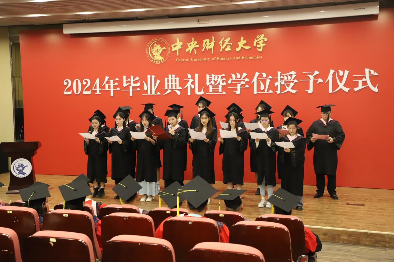 学位授予仪式的环节。张丛杉副经理宣读毕业生学位授予名单,张本家经理为毕业生们拨穗授予学位并颁发毕业证、学位证。