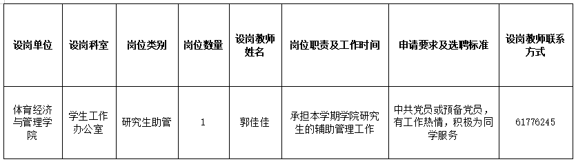 请有意向申报岗位的研究生于2024年3月12日17:00前根据公布的联系方式自行联系设岗教师进行申报。