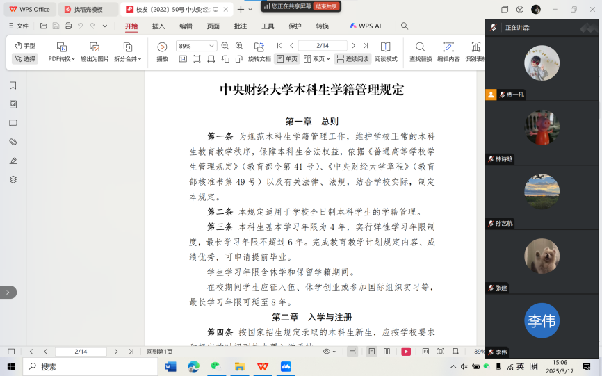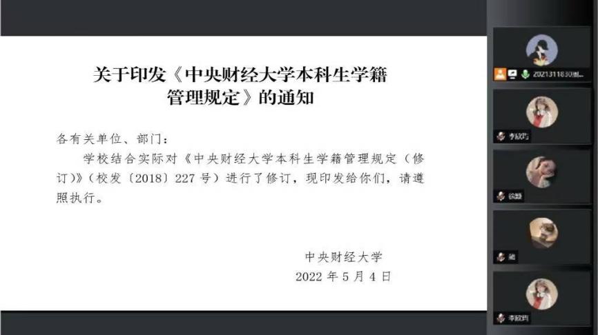 3月19日,体育经济与管理21-2班全体同学通过线上班会的形式,集中学习了相关制度文件。本次学习重点围绕学籍管理规定中毕业与结业条件、学业证书管理要求、辅修专业证书获取以及学历信息修改流程等。同学们就“结业换毕业申请次数”“辅修证书对主修学位的影响”等问题展开讨论。