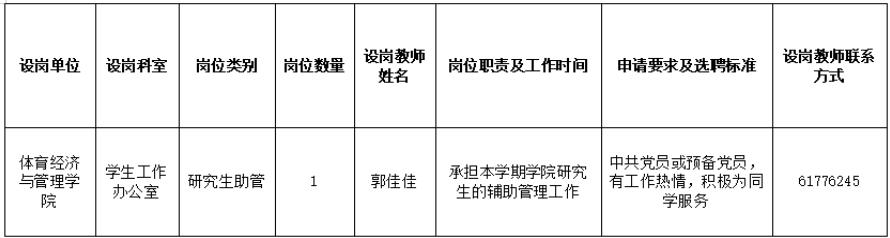 请有意向申报岗位的研究生于2024年9月20日17:00前根据公布的联系方式自行联系设岗教师进行申报。