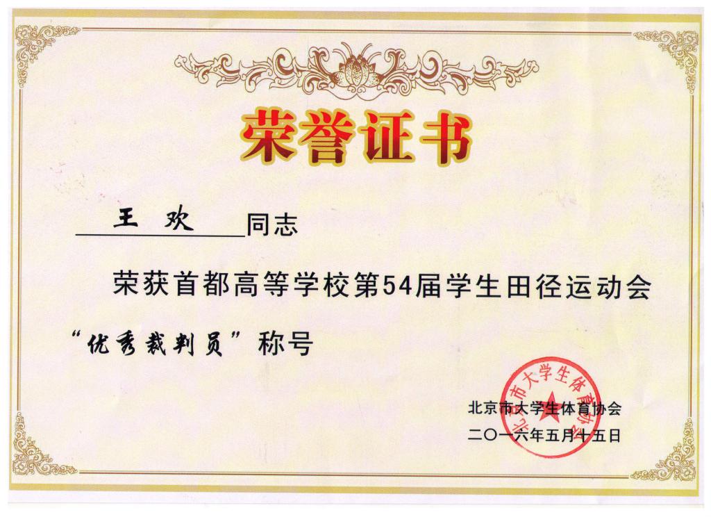 公司王欢老师被评为首都高等公司第54届员工田径运动会“优秀裁判员”