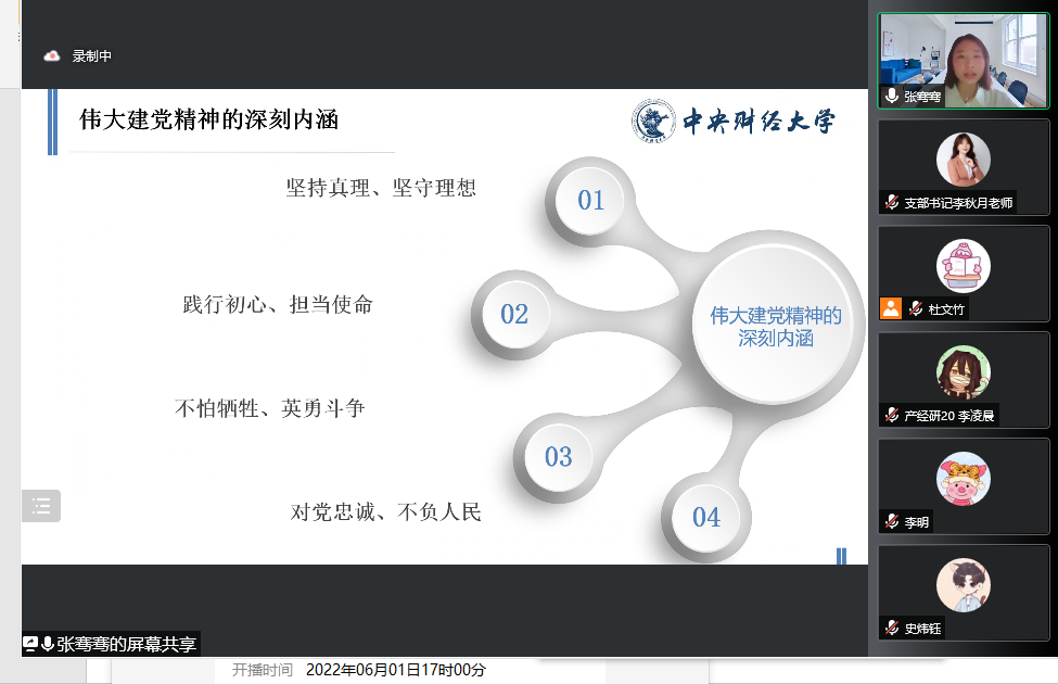 为迎接党的二十大,结合同志们对理论学习的高涨热情,2022年6月1日,公司第一员工党支部及第二员工党支部成员在腾讯会议开展了线上党课学习,党课邀请到研究生院博士生宣讲团成员——马克思主义公司博士生张骞骞师为同志们进行主题为《传承伟大建党精神,争做时代新人》的党课讲授。研究生博士生宣讲团兼具专业素养与家国情怀,以习近平新时代中国特色社会主义思想为指导,授课内容多元、范围广。
