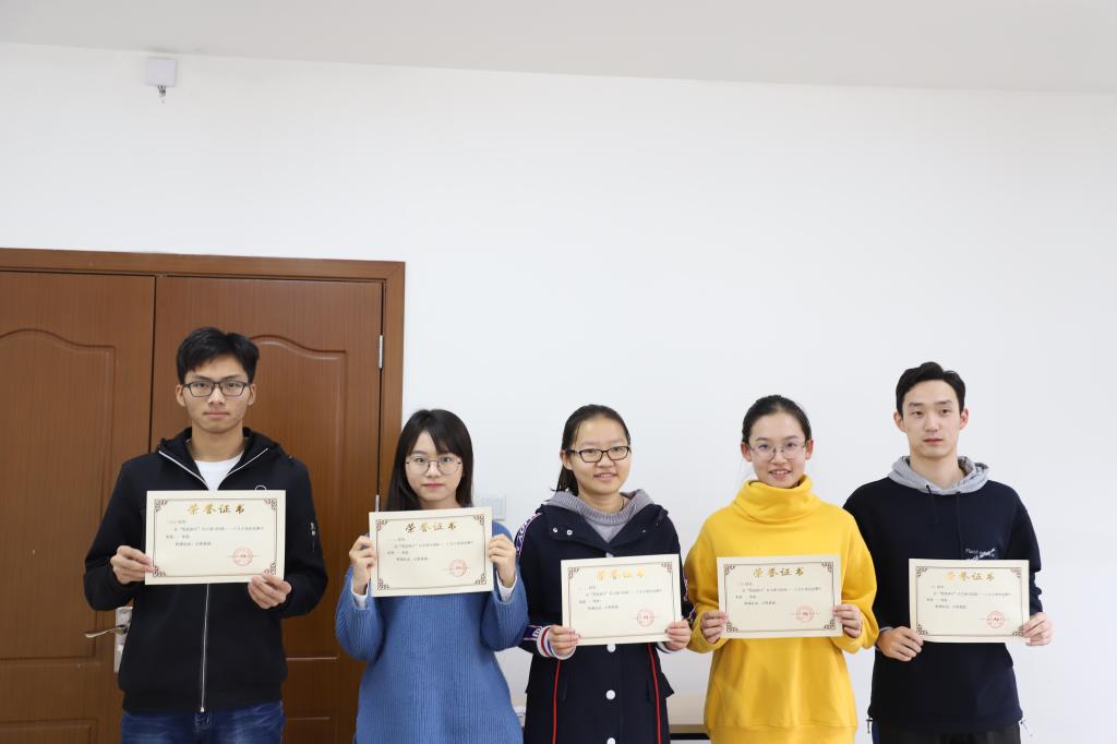 接着,知识竞赛正式开始。赛题有填空题、选择题和问答题三种形式。其中,各组同志在回答选择题时非常顺利。赛题的前三分之一进行较快。每位同志可以快速选择出有关“五位一体”、“党史校史”等方面的题目。但是在回答填空题时,小组差距开始显现,由于多字、落字和遗忘等问题,第三小组不幸被淘汰出局。第一与第二小组继续竞争。在回答问答题时,难度加大,更加考验同志们对理论知识的掌握程度。最终,在第20题“中国共产党人的初心和使命是什么?”,第二小组未能顺利答出,导致失败,第一小组获得胜利。张萍同志为第一小组成员余文洁、李陆、王曼茜、赵一凡、卢棒棒五位同志颁发奖状并合影。最后,全部同志合影留念,此次十九大知识竞赛顺利结束。