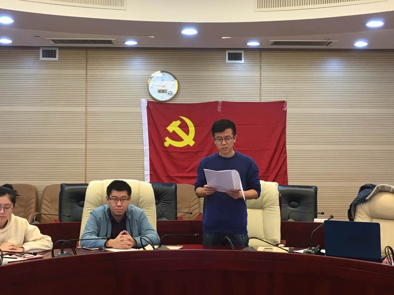 紧接着进行会议第二个环节,发展王泽宇为预备党员。王泽宇结合自身经历进行自我评价,详细介绍了自身从本科到研究生不断提升自身政治理论水平,提升综合素质,积极投身党支部相关活动,向党不断靠拢的过程。李凌睿、王升阳就王泽宇发展为预备党员发表意见,积极肯定了王泽宇在成为积极分子期间的优异表现。经过支部全体正式党员投票,一致通过发展王泽宇为预备党员。