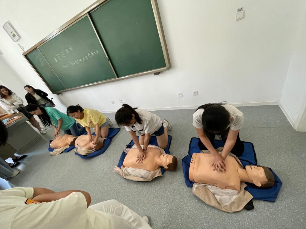 之后,师生学员被分成了三个小组,借助心肺复苏模拟人和AED训练机的进行了实践课程。在实践环节中,每个小组都有专业救护员进行指导。每位学员轮流模拟了心肺复苏和AED的使用,通过实际的操作掌握了相关技能。在实践的过程中,指导老师不仅纠正了学员们的错误,还给予了肯定和鼓励。
