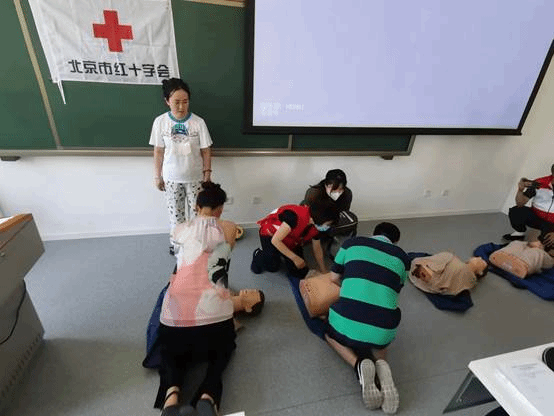 培训课程包括心肺复苏(CPR)和自动体外除颤器(AED)的使用,分为理论教学和实践操作两个部分。课程伊始,红十字会的培训师向师生介绍了心搏骤停的定义,并强调尽早进行心肺复苏是急救中至关重要的一环。随后,培训师们就心肺复苏的操作流程和AED的使用方法和步骤向学员们进行了理论知识的讲解,同时介绍了高质量心肺复苏的标准、心肺复苏的终止条件以及儿童、婴儿与成人心肺复苏操作流程上的差别,还重点强调了AED使用过程中的注意事项。