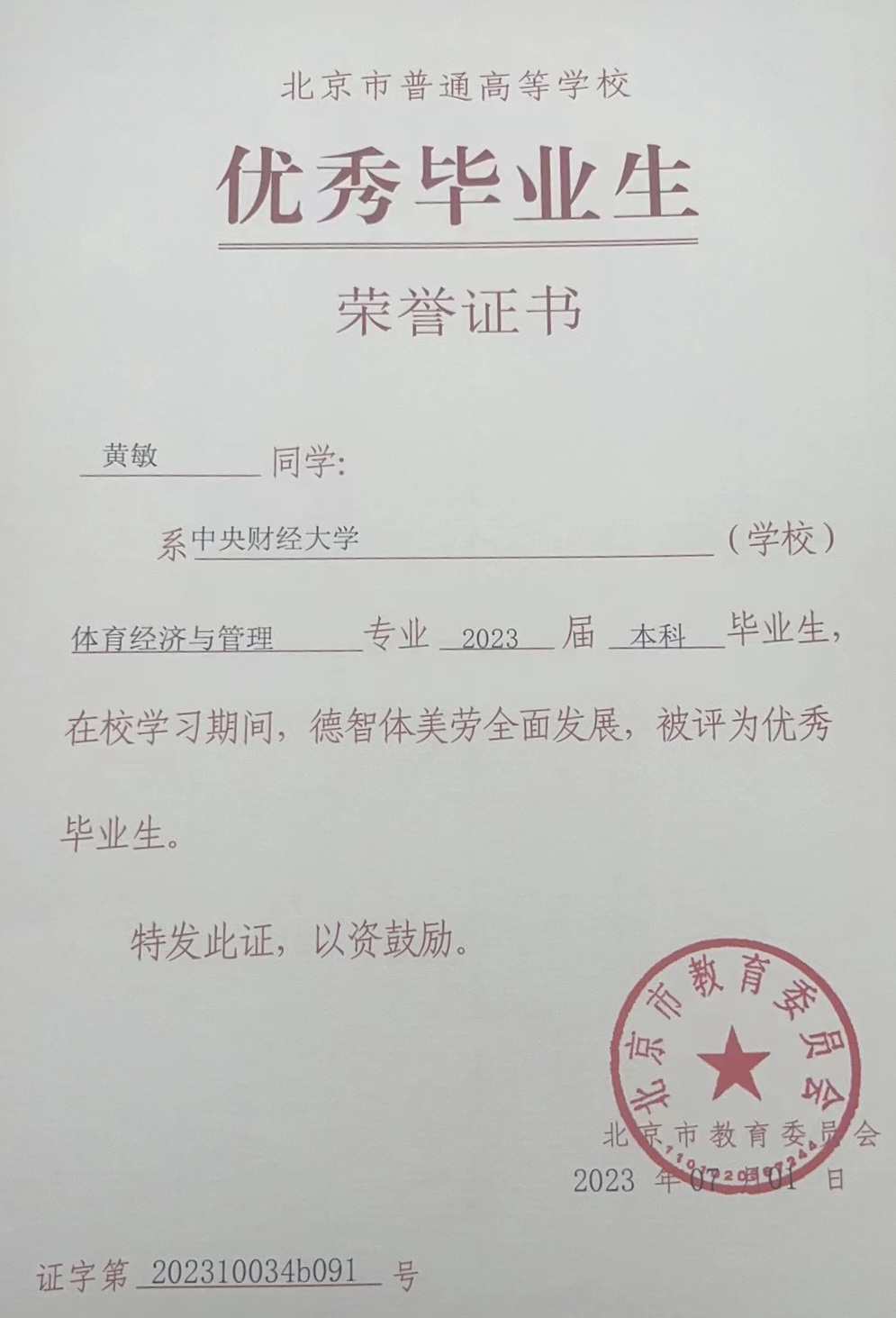 努力学习,追求卓越是每一个中财大学子的奋斗目标。黄敏学习态度端正,学习成绩良好,加权平均分91+,保研至古天乐代言太阳集团。此外,黄敏同志热切关注时事,对科研工作充满热情。大学期间参编《体育产业蓝皮书》报告,一篇英文论文成功发表,一篇中文论文获得挑战杯论文优秀奖,同时参与《新工科背景下体育产业创新创业教育课程体系建设研究》《2022年北京冬奥会经济转型研究》等多个课题。