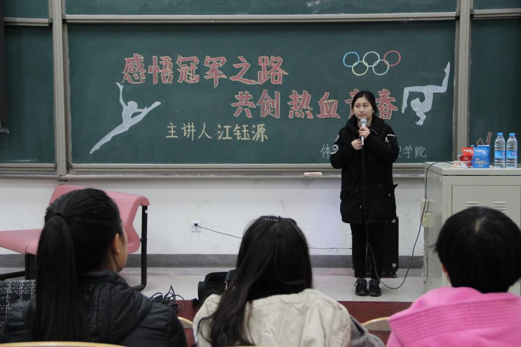 在讲座中,江钰源同在场师生分享了自己的体育生涯和人生经验。3岁起便开始学习体操,22岁退役。她毫不避讳在多年的体操训练中所遭受的苦痛,坦言训练的伤病及辛苦令她终生难忘,在这样的成长环境中,是不服输的精神和发自内心的自信帮助她取得越来越好的成绩,并一步步走上奥运冠军的领奖台。江钰源告诉同学们,积极的心理暗示和永不服输的信念是成功路上必不可少的因素。