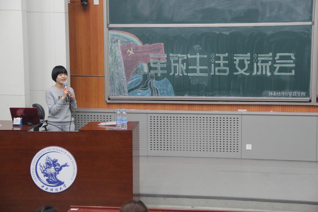 陈余同学原为2011级本科生,于2012年进入江苏武警8690部队,2014年光荣退伍。在会上,她首先用几张照片向同学们展示了部队的面貌,庄严的大门,排列整齐的楼房,高大的树木让同学们感受到了军营肃穆庄重的气氛。紧接着是几张宿舍的照片,干净整洁的房间,方方正正的被子,统一高度挂放的军装,体现了军人严格的自律性和一丝不苟的作风。使同学们钦佩不已。然后,陈余同学讲述了军旅生活的酸甜苦辣,军营里不乏艰苦的训练和流汗的付出,站军姿,练队列,3公里以上的耐力跑,田间劳作,一项项挑战身体极限的训练都在磨练着她们钢铁般的意志。她们做为话务兵每天都需要记上千个电话号码,其艰难程度可想而知。同时军营里也有温暖的战友情,她展示了和战友们一起包饺子,打扫卫生,参加文艺汇演的生活片段,脸上浮现的都是快乐的笑容。最后,她讲到了退伍前的不舍,退伍前一天晚上的聚餐和告别会,表达了对战友和军营的思念之情,照片上,这些平日钢铁意志的女兵也落下了离别的泪水。