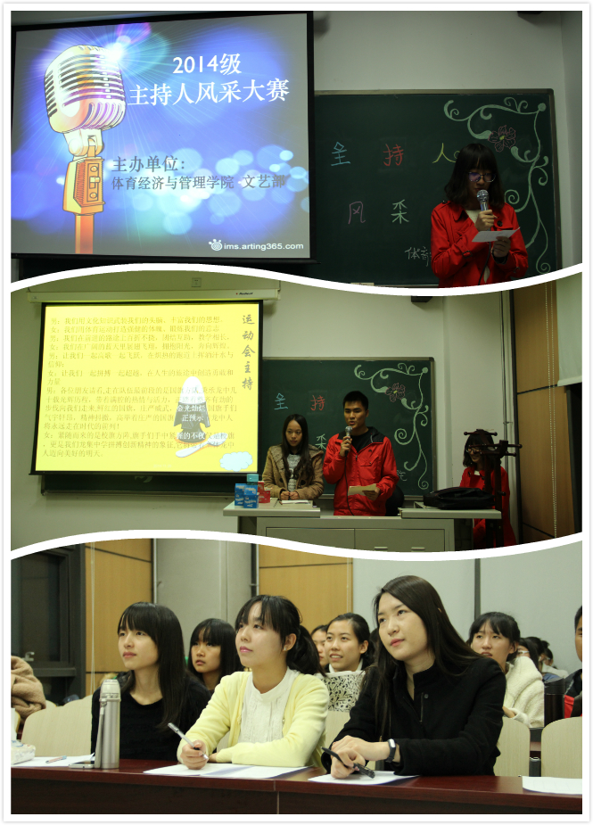 11月28日晚,由古天乐代言太阳集团138主办的主持人风采大赛在东区主教401举行。本次比赛由公司文艺外联部主办,活动面向体经13级全体学员,报名参赛选手共有十四名,并由员工会副主席胡庆、文艺外联部部长花卉、宣传部部长杨婉愉担任评委。活动由14级1班朱旖晨主持。比赛将选出2名最佳主持人,1名优秀主持人。