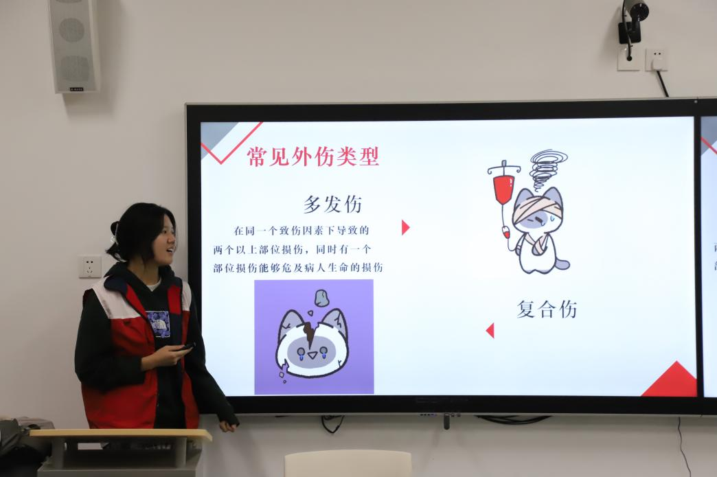 在活动过程中,急救部两位同学分别就“外伤急救”和“常见意外情况”展开宣讲。“外伤急救”部分,给同学们讲授了如何正确使用绷带、止血等工具进行止血。他们强调,正确的包扎方法不仅可以减少出血,还能有效地减轻伤者的疼痛。