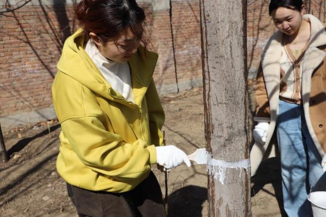 今天劳动实践的任务是给树干刷保护漆。在劳动实践现场,昌欣物业的工作人员以严谨细致的态度,首先对刷漆方法及要点进行了深入讲解,并向参与活动的同学们发放了刷子、油漆桶及手套等劳动工具。为树干刷漆并非仅是表面的装饰工作,特制的环保涂白剂不仅能够有效预防害虫和低温伤害,还能通过反射阳光,防止树皮因紫外线照射而产生开裂现象。同学们在劳动实践中深刻领悟到生态保护的重要性,内心的责任感和自豪感油然而生。他们以四人为一组,从涂料调配、树皮清理到粉刷养护,每个环节认真完成。