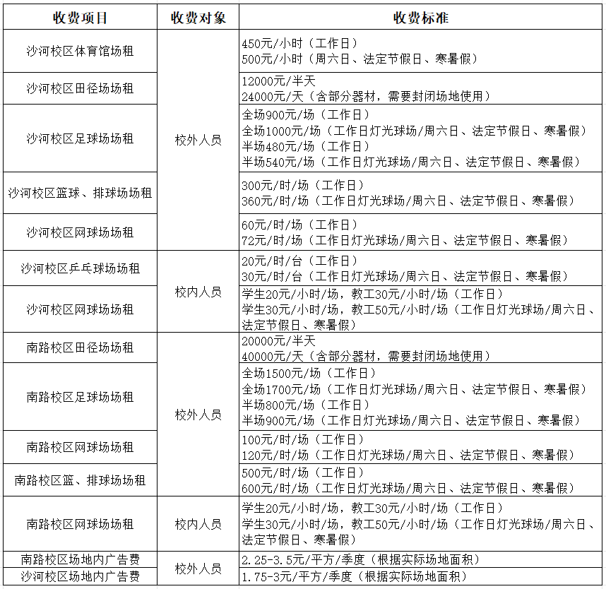 员工30元/小时/场,教工50元/小时/场(工作日灯光球场/周六日、法定节假日、寒暑假)